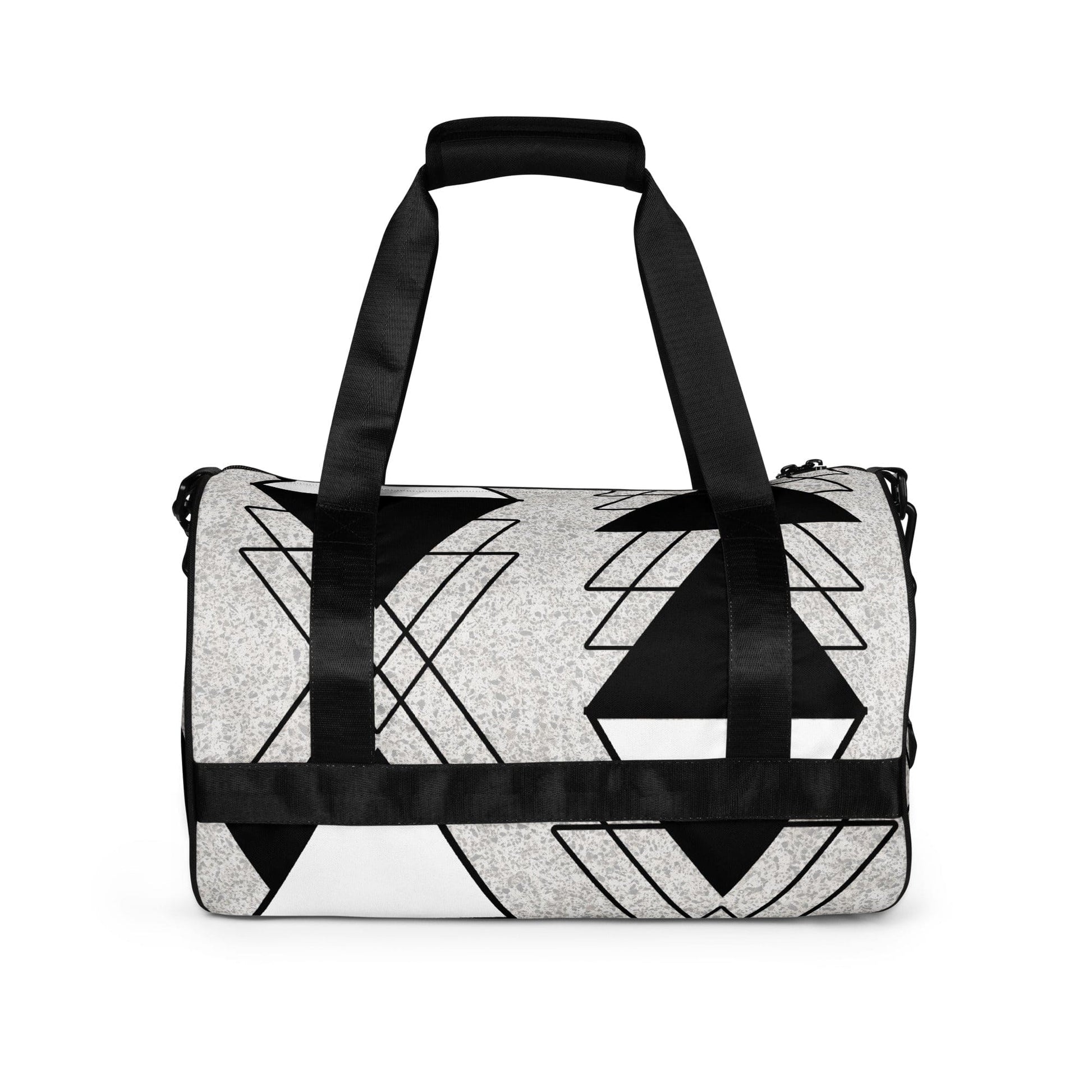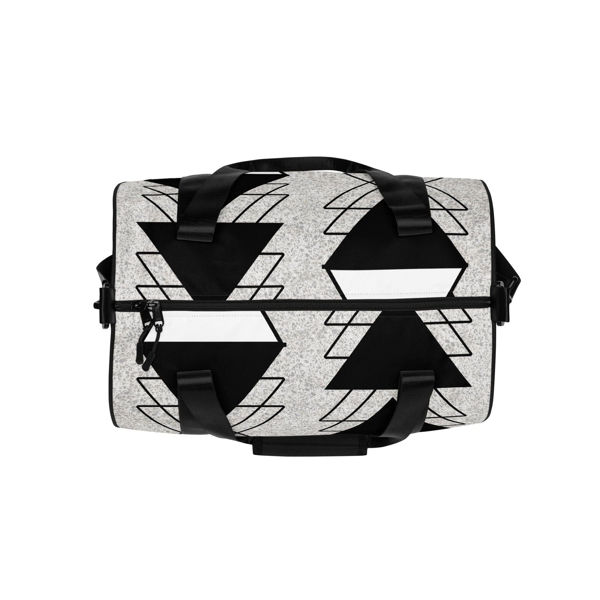 Crossbody Water-Resistant Travel Bag, Black And White Ash Grey Triangular Colorblock. Ready to get your fitness on? Add some punch to pumping iron with this bag. Made from 100% polyester and sturdy, water-resistant fabric, this bag is fun meets function. And itβs got pockets!