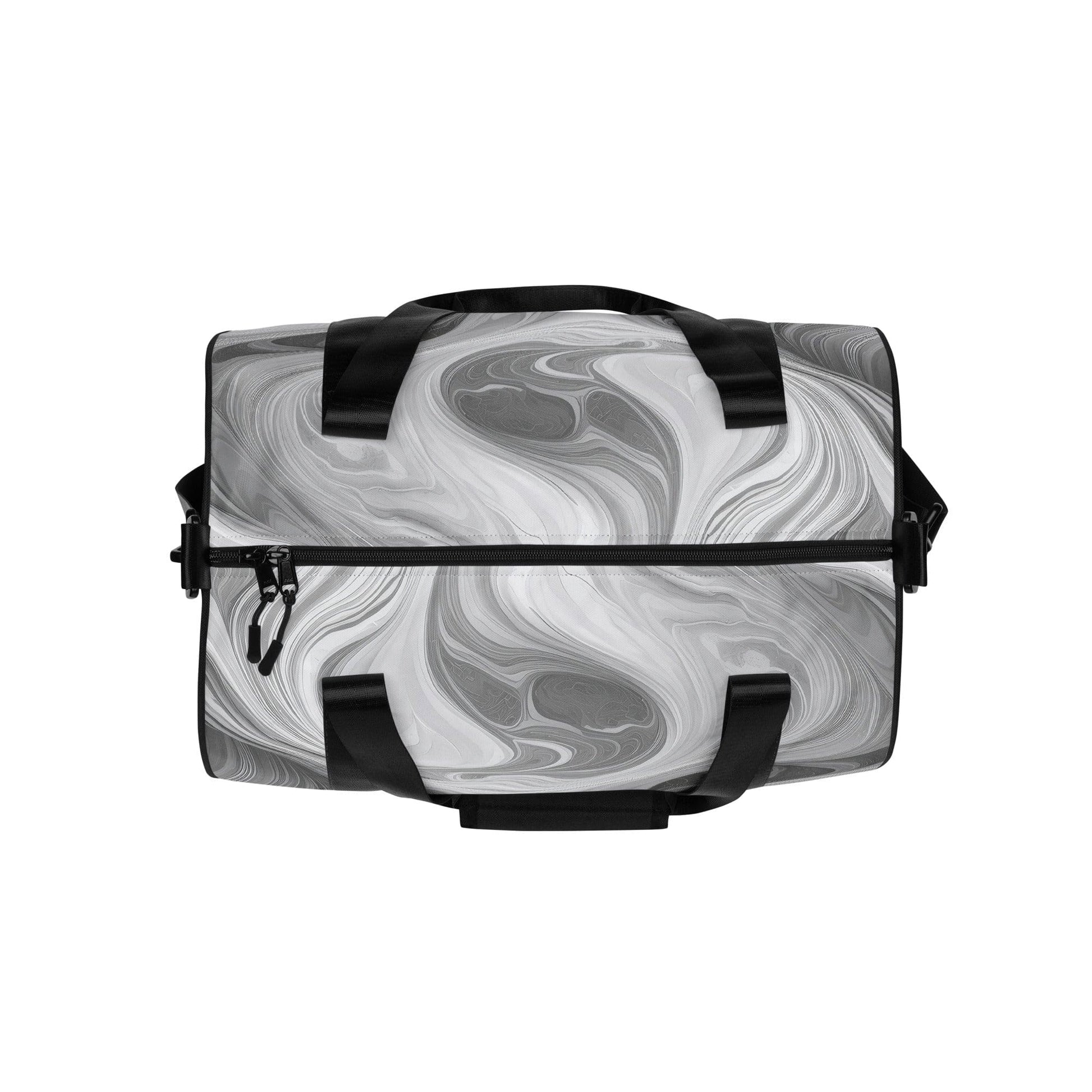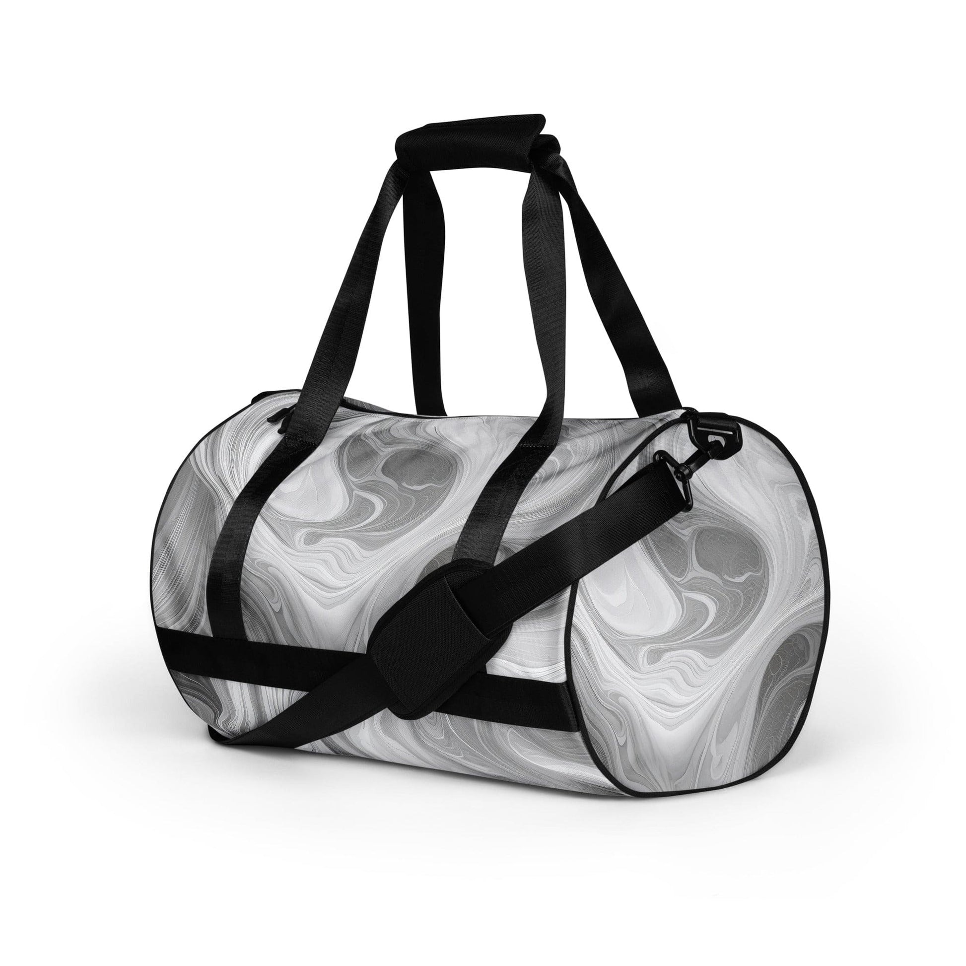 Crossbody Water-Resistant Travel Bag, BOHO Marble Pattern White And Grey. Ready to get your fitness on? Add some punch to pumping iron with this bag. Made from 100% polyester and sturdy, water-resistant fabric, this bag is fun meets function. And it’s got pockets!