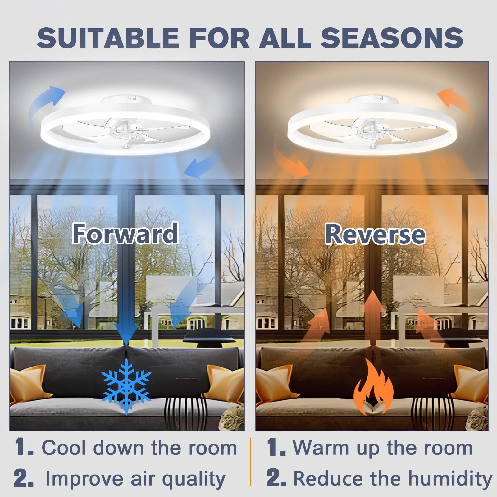 This ceiling fan light combines lighting and fan functions in one, unique and practical design. It is equipped with a remote control for easy and quick operation, which not only enables 3-colour infinitely dimmable light to meet different lighting needs, but also has a 6-speed wind speed adjustment function to make the breeze go with you and make you comfortable. The fan blade adopts reversible design, which can adjust the wind direction according to the seasonal change, and the low noise operation does not affect the rest and work. Its wide range of applications, whether it is a home living room, bedroom, or restaurant, shops and other places, can be perfectly integrated to bring you a comfortable and pleasant environmental experience.
